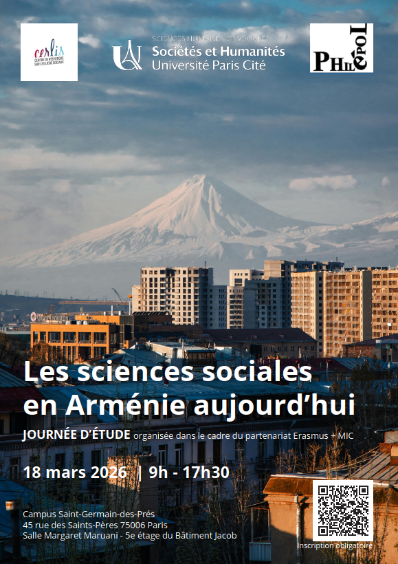 Cette journée d’étude s’inscrit dans le cadre du projet Erasmus + établi entre l’UFR des Sciences humaines et sociales de l’université Paris Cité et l’université d’État d’Erevan, avec l’appui du PHILéPOL (URP 75038) et du CERLIS (UMR 8070). Elle se déroulera le 18 mars 2026, de 9h à 17h30, dans la salle Margaret Maruani au 45 rue des Saints-Pères 75006 Paris.